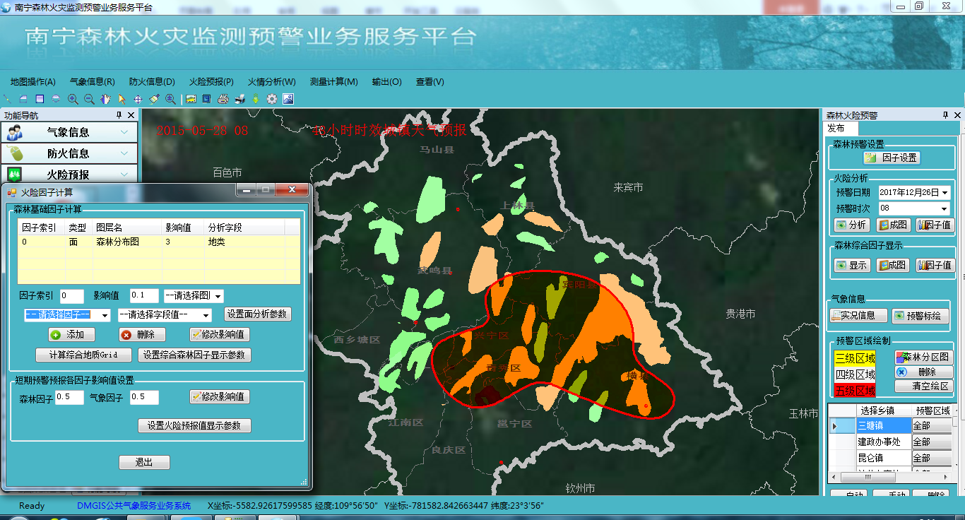 广西南宁市森林火险气象预警平台是南宁市气象局与林业局的信息化软件合作项目,以森林火险气象监测预警为目标,基于气象实况预报基础数据、森林植被数据、卫星遥感数据等,实现森林火险气象预警分析、火源点卫星遥感分析、火情蔓延分析与灾情模拟等功能,包括气象信息、防火信息、火险预报、火情分析、三维沙盘、标绘演练、系统发布、系统管理等功能。