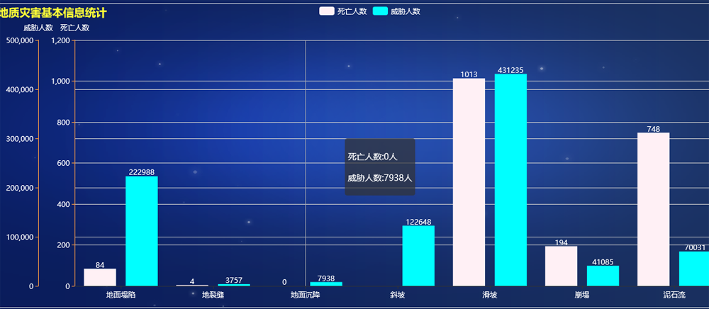 数据统计包括表格统计和图形统计,基于行政区划、灾害类别、险情等级、灾情等级、规模等级等条件,实现对基础调查数据的统计分析与结果展示。